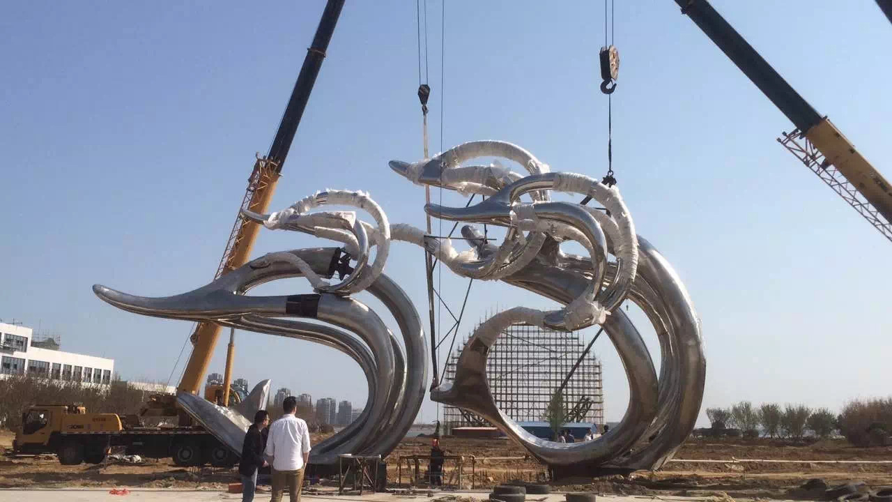 威海櫻花湖體育公園《遨游》不銹鋼雕塑-安裝現(xiàn)場